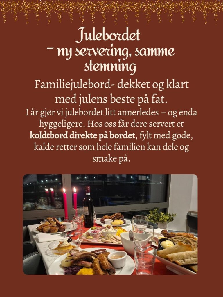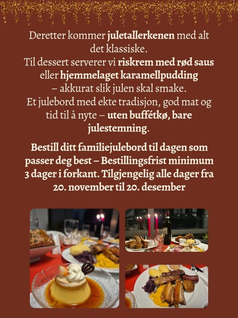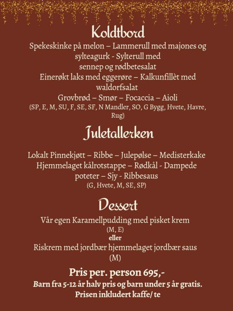 I år gjør vi familiejulebordet litt annerledes – og enda hyggeligere. Hos oss får dere servert et koldtbord direkte på bordet, fylt med gode, kalde retter som hele familien kan dele og smake på. Deretter kommer juletallerkenen med alt det klassiske. Til dessert serverer vi riskrem med rød saus eller hjemmelaget karamellpudding – akkurat slik julen skal smake. Et julebord med ekte tradisjon, god mat og tid til å nye – uten buffétkø, bare julestemning.