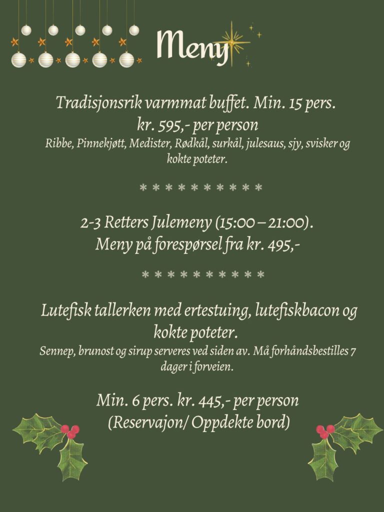 Våre lokaliteter og strategisk plassering, gjør oss til et naturlig møtested for ditt juleselskap. Hos oss kan dere samles og nyte god julemat fra vårt kvalitetsbevisste kjøkken, med tilpasset drikke av alle slag. I rolige omgivelser kan dere kose dere i godt selskap med familie, venner og kollegaer. Vi tilbyr flere varierte julemenyer som kan bestilles til den dag det passer dere best.